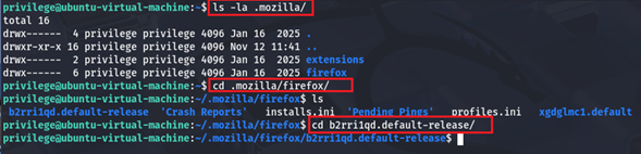 Se comprueba la existencia del directorio .mozilla/firefox en la máquina comprometida para buscar bases de datos de historial y marcadores que puedan contener credenciales.