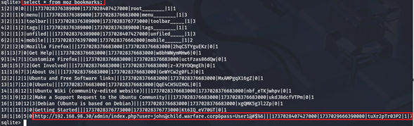 Encontramos algunas credenciales interesantes en la base de datos de marcadores de Mozilla.