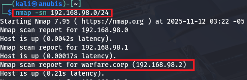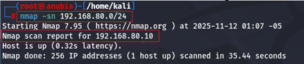 Se utiliza nmap para escanear el rango de la red externa (192.168.80.0/24) y descubrir hosts activos.