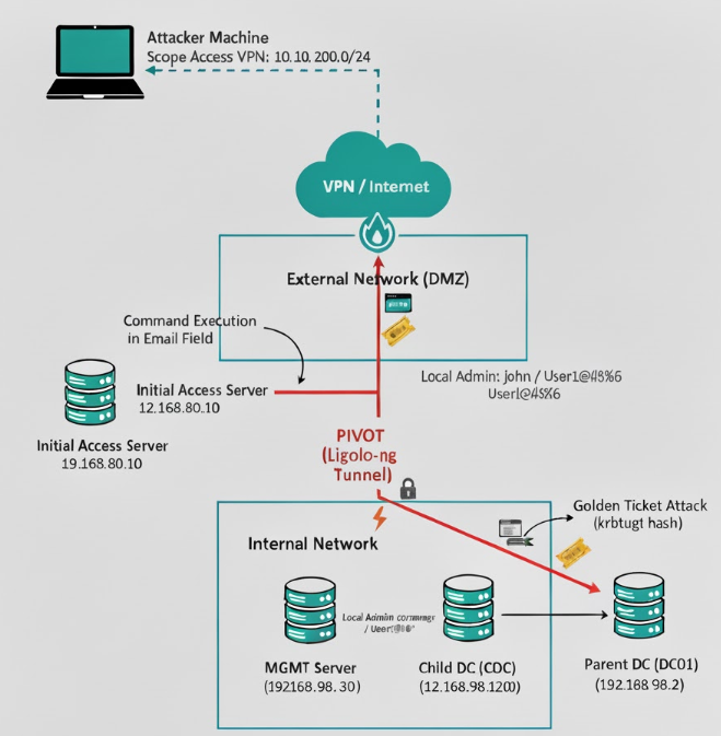 Este ejercicio simula un escenario de penetración en una infraestructura corporativa con una red altamente segmentada y una jerarquía de Active Directory (dominios Padre e Hijo). El ejercicio comienza con el acceso inicial a un sistema perimetral, para luego requerir el pivoteo de red a través de un túnel para acceder a la red interna y sus sistemas críticos. El objetivo final es la escalada de privilegios a nivel de dominio, aplicando técnicas de post-explotación como la extracción de credenciales (LSA Dump), el movimiento lateral (Pass the Hash), y el forjado de tickets de autenticación maestra para el control completo del Active Directory (Golden Ticket Attack).