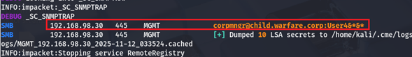 Se utiliza crackmapexec para realizar un volcado de secretos LSA en el servidor MGMT (192.168.98.30), obteniendo la credencial en texto plano del usuario corpmngr:User4&*&**.