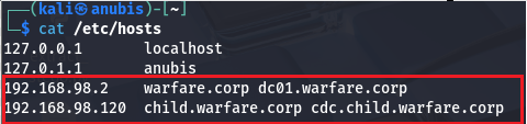 Se actualiza el archivo /etc/hosts en la máquina atacante para mapear las IPs de los Controladores de Dominio con sus nombres DNS correspondientes (warfare.corp y child.warfare.corp).