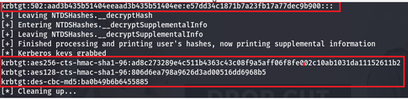 Se utiliza impacket-secretsdump en el Child DC para extraer los hashes de la cuenta de servicio krbtgt, el componente clave para el ataque Golden Ticket.