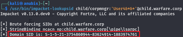 • /usr/bin/impacket-lookupsid child/corpmngr:’User4&&‘@child.warfare.corp