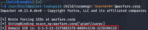 • /usr/bin/impacket-lookupsid child/corpmngr:’User4&&‘@warfare.corp