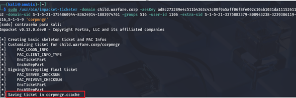 Se utiliza impacket-ticketer junto con el hash krbtgt y los SIDs de ambos dominios para forjar un Golden Ticket y guardarlo en el archivo corpmngr.ccache.