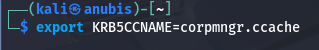 Se exporta el archivo corpmngr.ccache a la variable de entorno KRB5CCNAME, cargando el Golden Ticket para su uso en la autenticación Kerberos.
