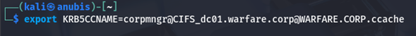 • export KRB5CCNAME=corpmngr@CIFS_dc01.warfare.corp@WARFARE.CORP.ccache