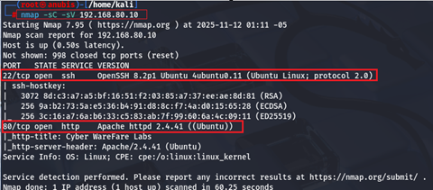 Se realiza un escaneo detallado al host 192.168.80.10, revelando que el puerto 80 (HTTP) y el 22 (SSH) están abiertos.