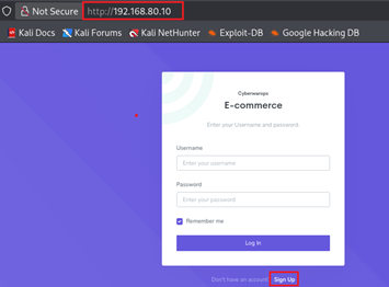 Se accede al servidor web en 192.168.80.10 y se identifica la página de registro (Sign Up), necesaria para buscar el punto de entrada de la explotación.