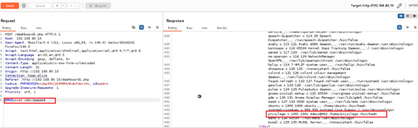 Al inyectar el comando cat /etc/passwd, el servidor ejecuta el RCE y devuelve el contenido del archivo, revelando el usuario privilege para el acceso inicial.